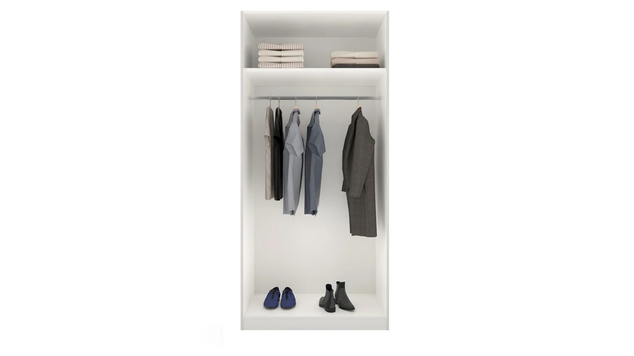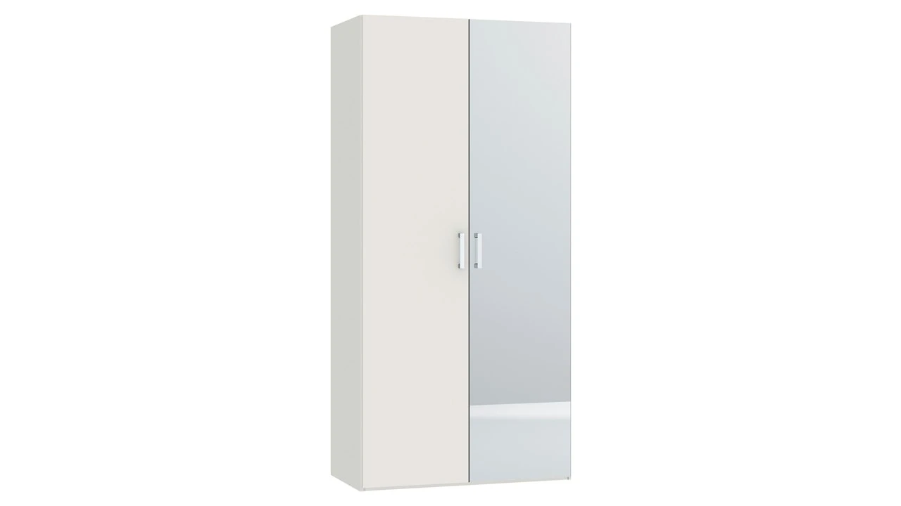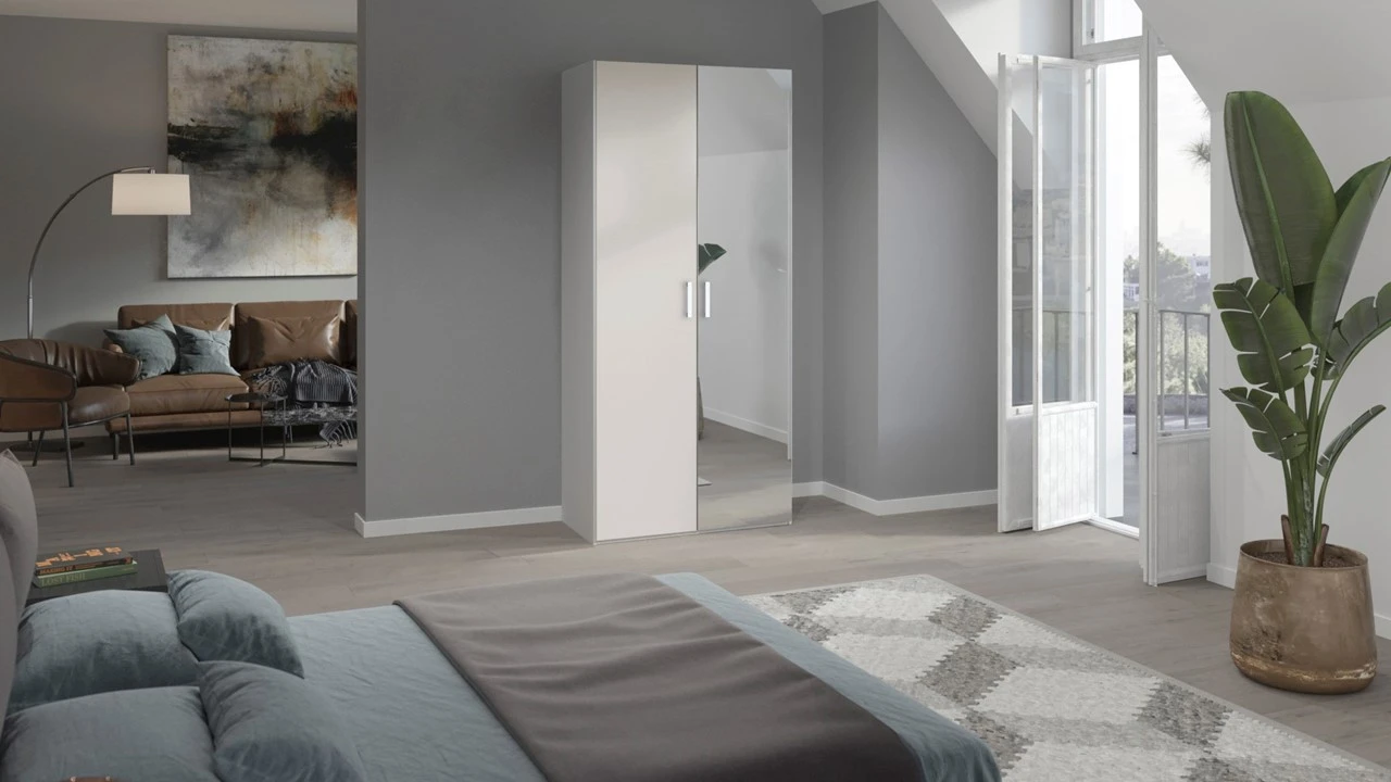 De draaideurkast heeft twee deuren met 1 spiegel. De binnenkant van de kledingkast bestaat uit 1 legplank en 1 roede over de volle breedte, en is uit te breiden met extra legplanken. De kledingkast is verkrijgbaar in diverse kleuren én afmetingen.