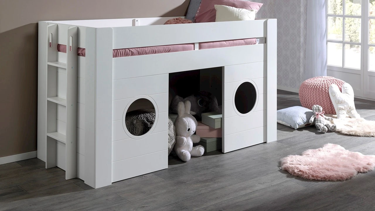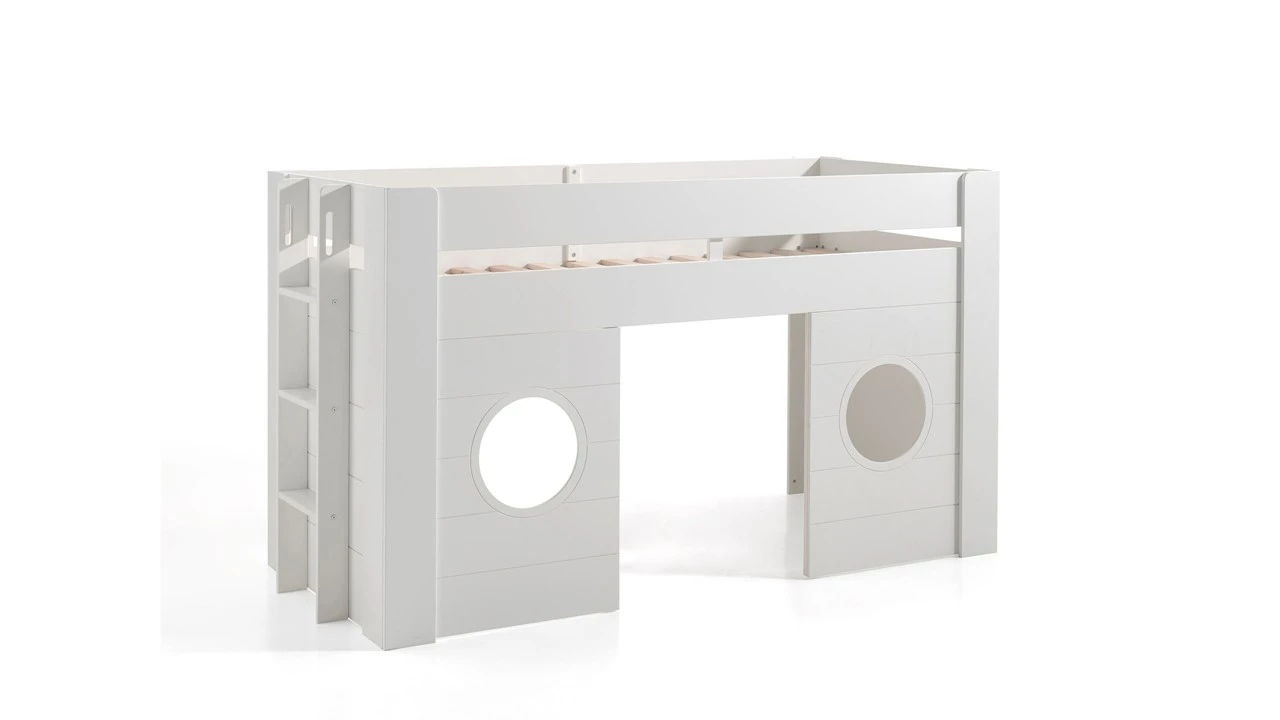 Halfhoogslaper Freya van Vipack is een speels en zeer praktisch bed voor iedere kinderkamer. Het bed belooft uren slaap- en speelplezier! Onder het bed zit een leuke speelruimte. De zijkanten hebben twee dichte panelen en de voorkant heeft twee panelen met een ronde opening