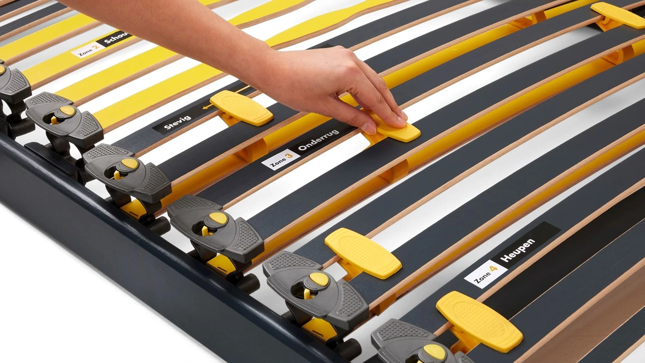 Dankzij een eenvoudig schuifmechanisme bepaal je heel gemakkelijk zelf de extra veerkracht en ondersteuning bij je heupen. Ben je een zijligger? De schouderzone veert goed en diep in waardoor je schouders ontlast worden, je lichaamshouding verbetert en je extra comfortabel ligt. De latten overlappen de gehele breedte van de bodem, waardoor je ook over de gehele breedte van ondersteuning geniet.